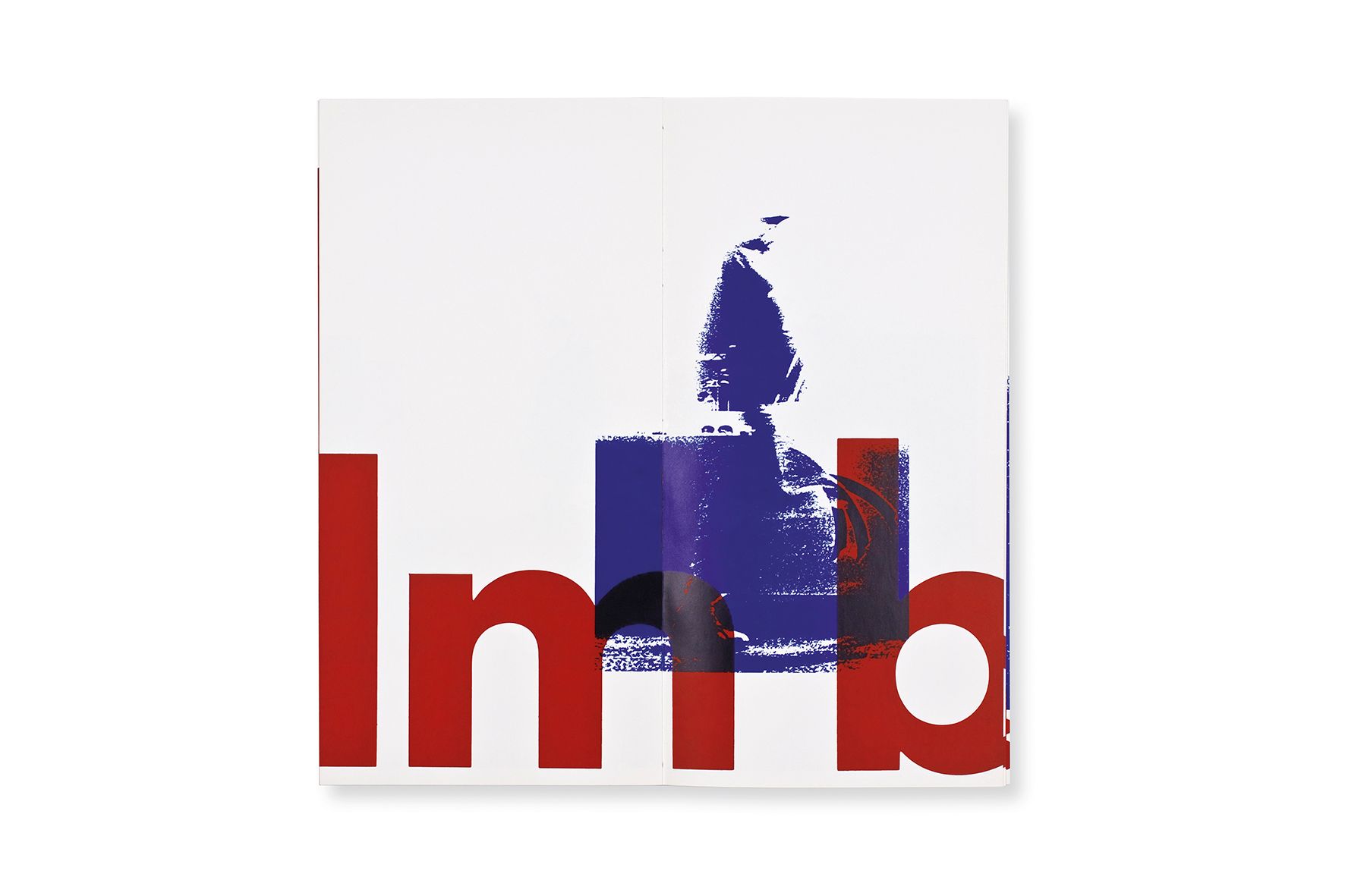 The first poem from the cycle “L’Homme Machine Bleue” by Ernst Meister is counterposed with a photograph showing an abstract figure. The photograph and text reappear on each double-page spread in twelve different size combinations. The larger the blue photograph grows, the smaller the red-printed typography becomes.