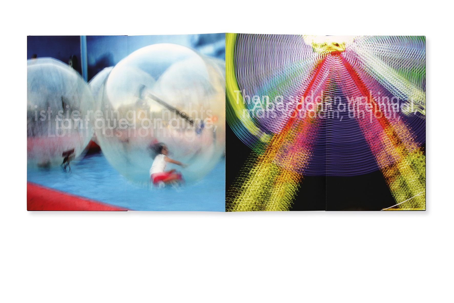 This accordion shows two photographic series with two different motifs, taken in Vienna’s Prater amusement park with time exposure. The two motifs, which alternate rhythmically in the accordion, thematize movement, circles and time. The photographs integrate a text excerpt from the first act of Hugo von Hofmannsthal’s “Der Rosenkavalier” [The Knight of the Rose], in the original German as well as in a French and English translation: “Die Zeit, die ist ein sonderbares Ding / Le temps est subtil comme un poison / Time – how strangely does it go its ways.” The texts come in various sizes and levels of transparency, overlapping with each other in the photographs.