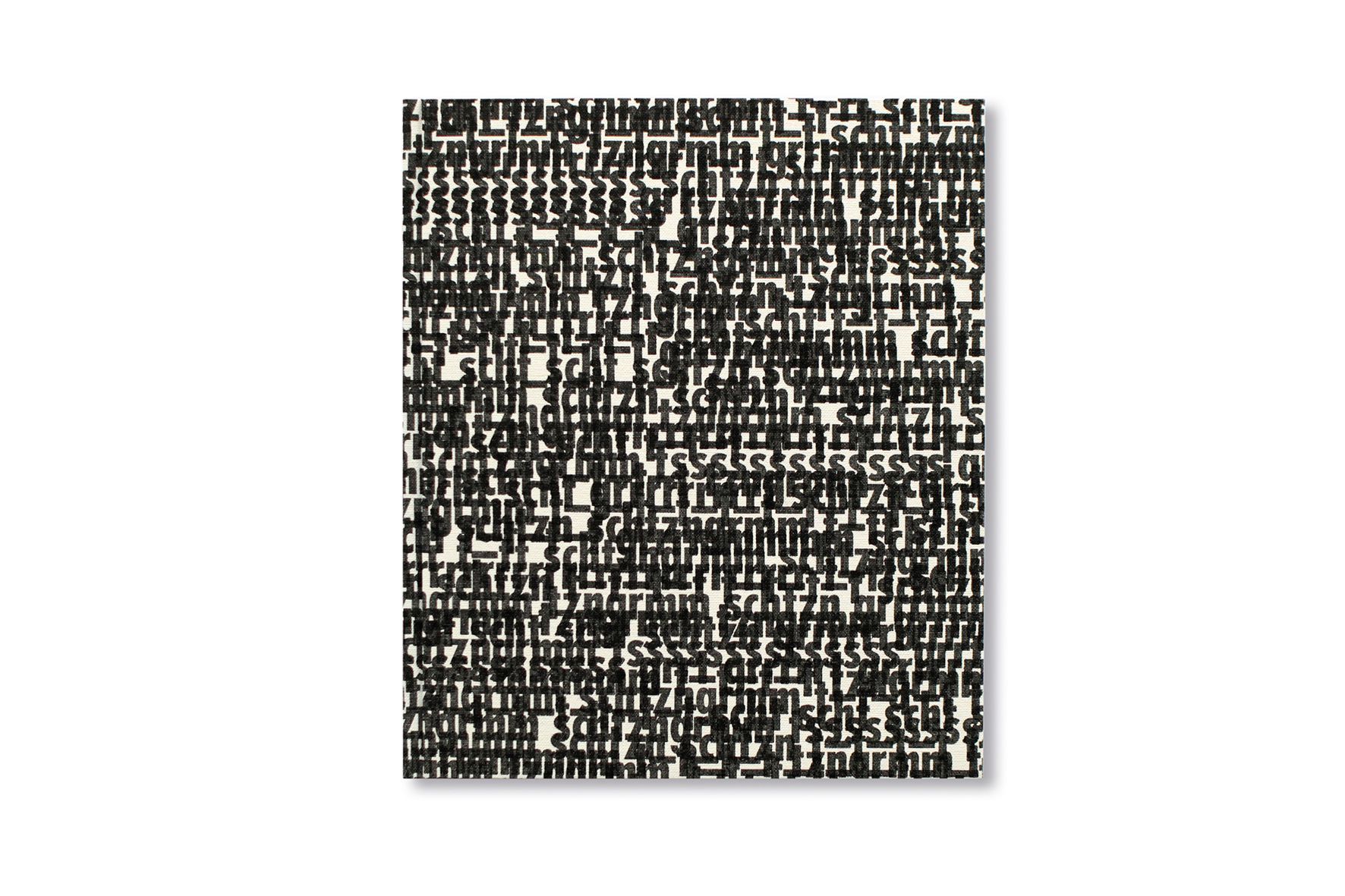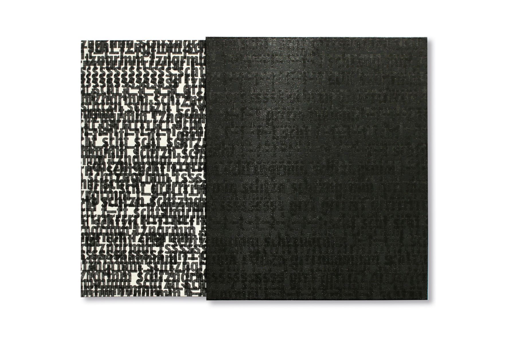 Handsatz (Futura schmalfett, 48 Punkt) und Buchdruck, bedruckter Gewebeband (18,2 x 21,2 cm) in bedrucktem Gewebeschuber (18,8 x 21,7 x 1 cm), Pergaminpapier und schwarzes Papier, 78 Seiten, 25 nummerierte und signierte Exemplare, Flörsheim am Main 2023
