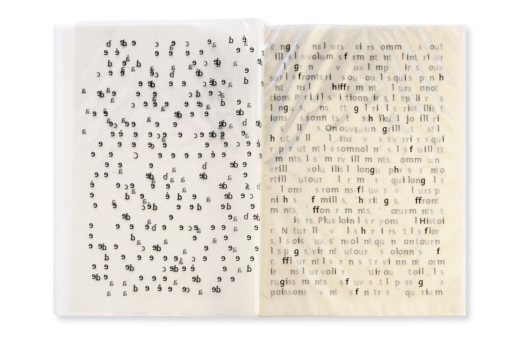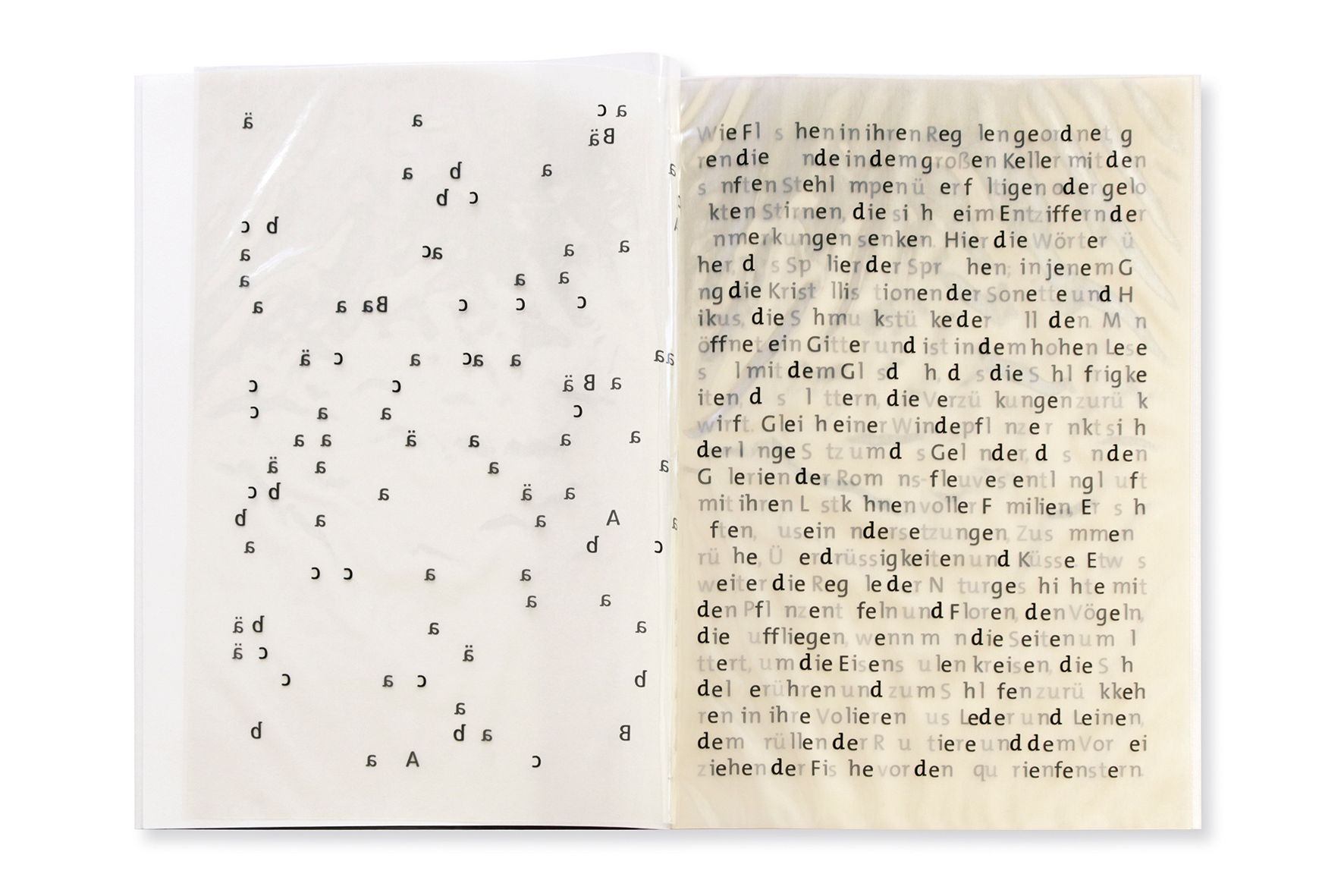 This project consists of two volumes with a text excerpt from Michel Butor. The volume “Alpha” contains the French original, “Itinéraire – Les Bibliothèques” [Itineraries – The Libraries], and the volume “Beta” contains the German translation. The text, which paints a portrait of a universal library, could fit on a single page in each volume, but instead it is broken down into its letter components. In the spirit of Jorge Luis Borges’ “Library of Babel,” which he describes as a universal library containing every imaginable book, each of the 26 letters that make up the text is printed separately on its own page in each volume. The first page features all of the A/a letters, the second page all of the B/b letters, etc. Each letter is in the same position that it would have on a complete printed page. Because of the transparency of the cellophane pages, the entire text can be read on the first page. Theoretically, the raw material of the separated 26 letters could be used to create any other possible text.