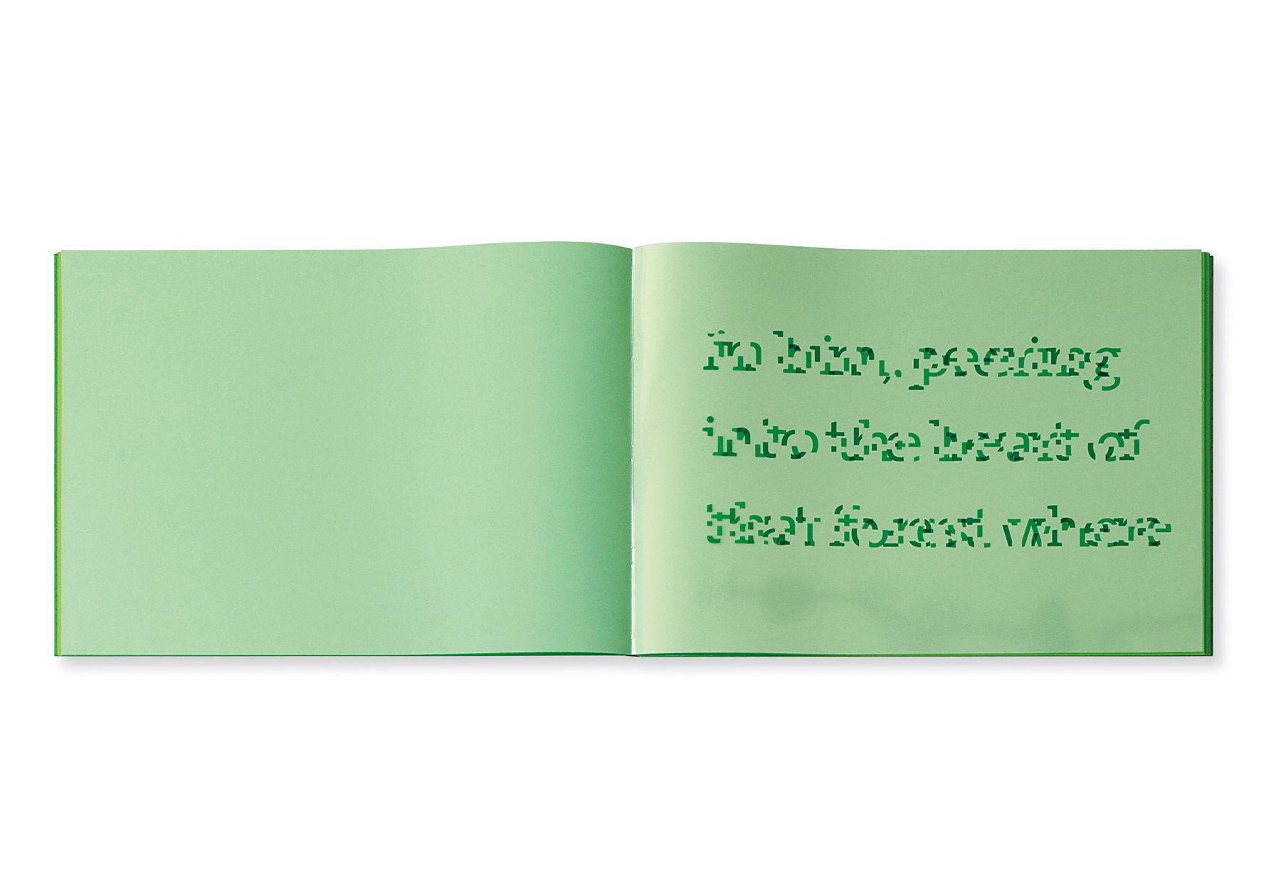 Using an excerpt from Virginia Woolf’s text “To the Lighthouse,” this book attempts to visually represent the themes of dissolved shapes, abstract signs, recognizing the shape of a letter. Each of the letters in the excerpt is individually split in two on the computer. Next, the two fragment levels are printed on two transparency films in various shades of green; the films overlay one another in the bound book. The two fragment levels are slightly shifted from one another, and the reader can align them by sliding the films over, making the text legible. At the end of the book is a double-page spread with the German translation of the text: “Zum Leuchtturm.”